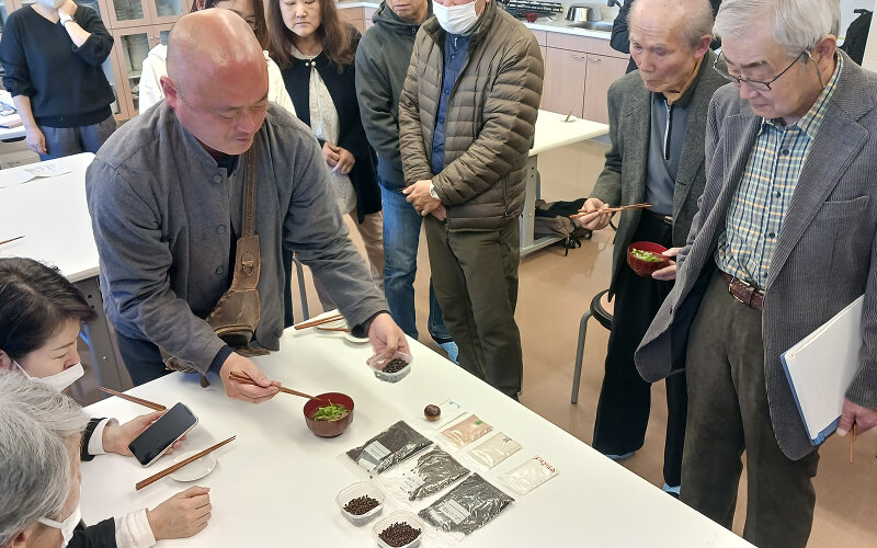 ドングリ澱粉100%の餅を用意し、「味付けなし」「イボキサゴ出汁のみ」「イボキサゴだし+イノシシ肉エキス」で味付けしたところ、イボキサゴや昆布の出汁で塩分を追加することでよりうま味や甘未が感じられ、おいしく味わえることがわかりました。試食した参加者からは「イボキサゴ採取会で食べた時よりおいしくなっていた」「食材が健康的にもよさそうだ」といった感想が出ました。